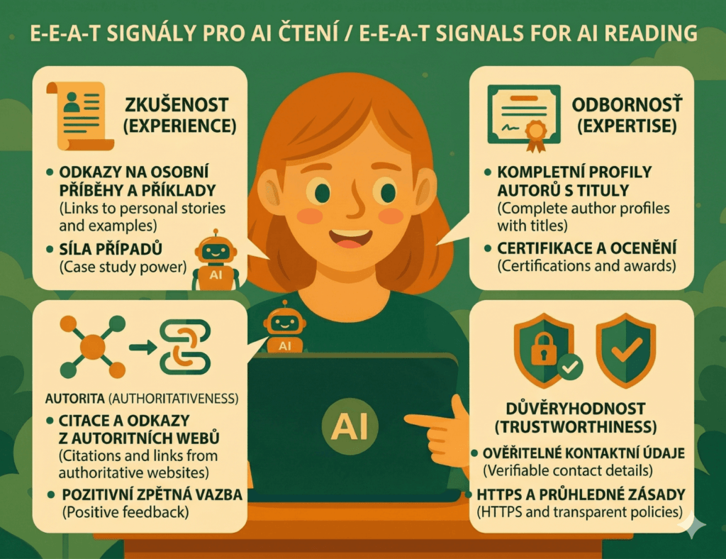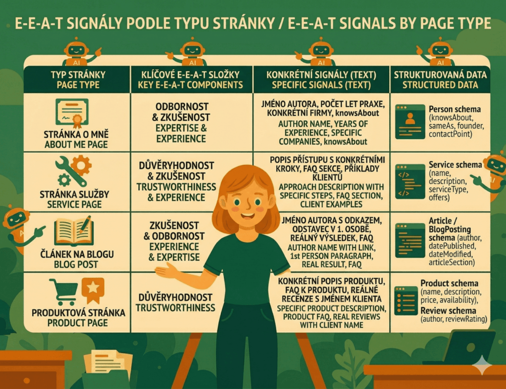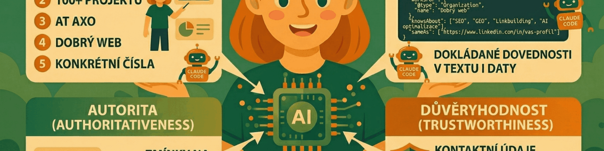 | Chcete vědět, jak AI čte váš E-E-A-T? Provedu audit E-E-A-T signálů vašeho webu, zkontroluju structured data, Person schema i viditelnost odbornosti v textu a navrhnu konkrétní úpravy. Přečtěte si více na GEO & AI optimalizace |