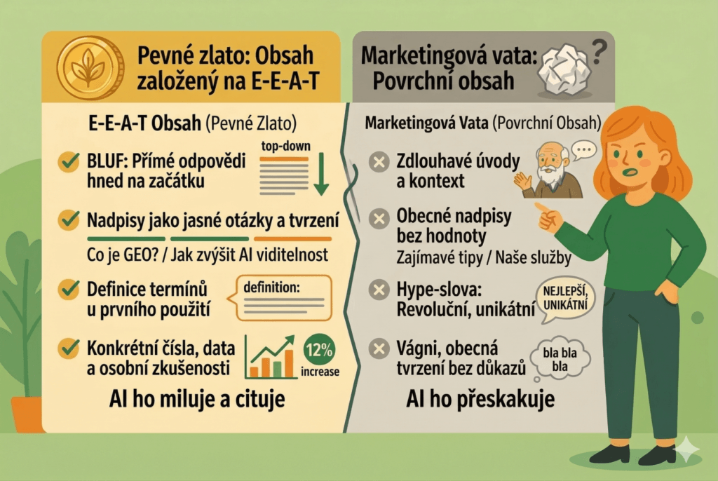 To má přímý dopad na to, jak psát. Obsah optimalizovaný na klíčová slova a délku textu AI nepřesvědčí. Obsah strukturovaný jako přímá odpověď na otázku ano.