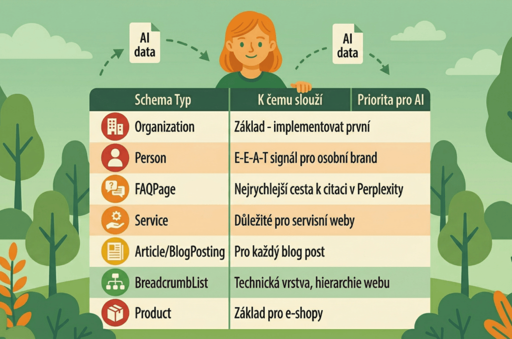 Organization říká AI, kdo za webem stojí, bez toho jsou ostatní schema méně důvěryhodná. FAQPage je nejrychlejší cesta k citaci. Perplexit0,y FAQ odpovědi přímo vyzobává a zobrazuje jako zdroje. Kombinace obou zvládnete za odpoledne.